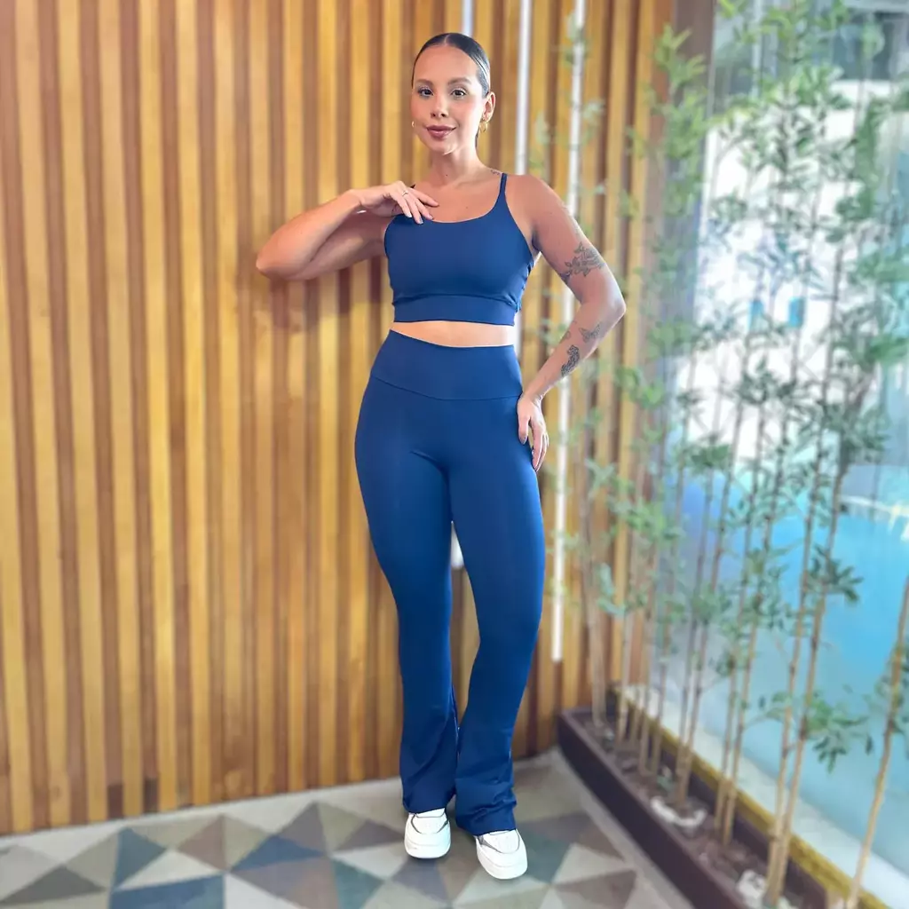 Essa legging tem aquela modelagem clássica das calças "boca de sino". Com um cós reto e um ótimo ajuste ao corpo, a diferença dessa legging para a legging clássica fica na parte abaixo do joelho, que vai folgando até a barra, dando movimento à peça.