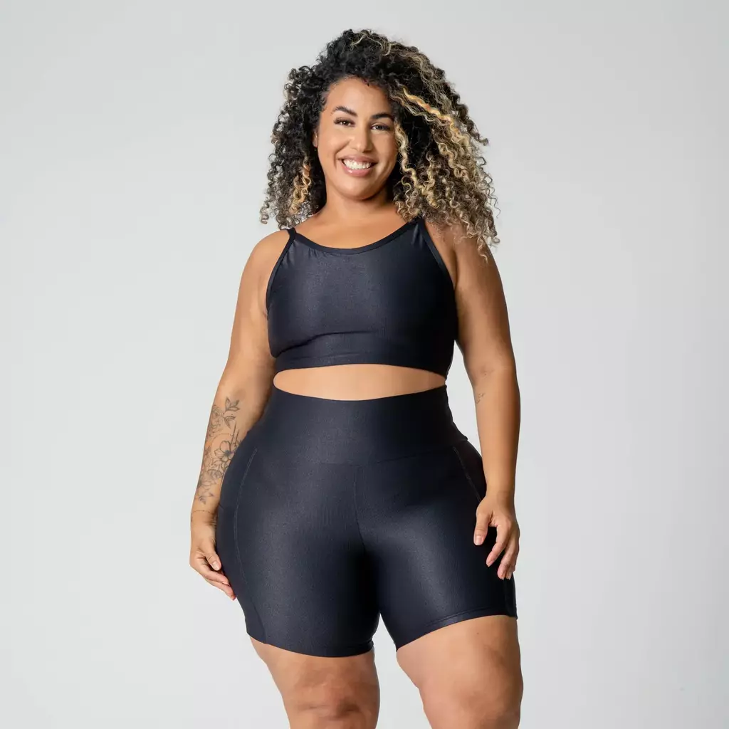 O aveludado de compressão é um tecido altamente elástico e respirável, e conta até mesmo com proteção UV+, garantindo conforto para fazer as atividades físicas. O fator de compressão faz com que o tecido se ajuste bem ao corpo e disfarce celulites e imperfeições.