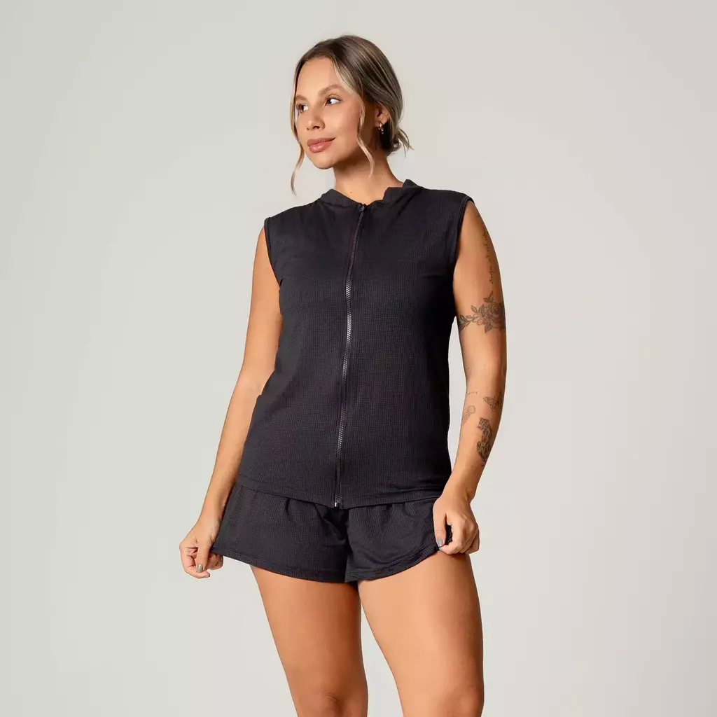 Uma mistura de short com bolso, top com alças finas e colete com zíper formam esse trio super versátil para diversos tipos de atividades, em especial, as que são ao ar livre.